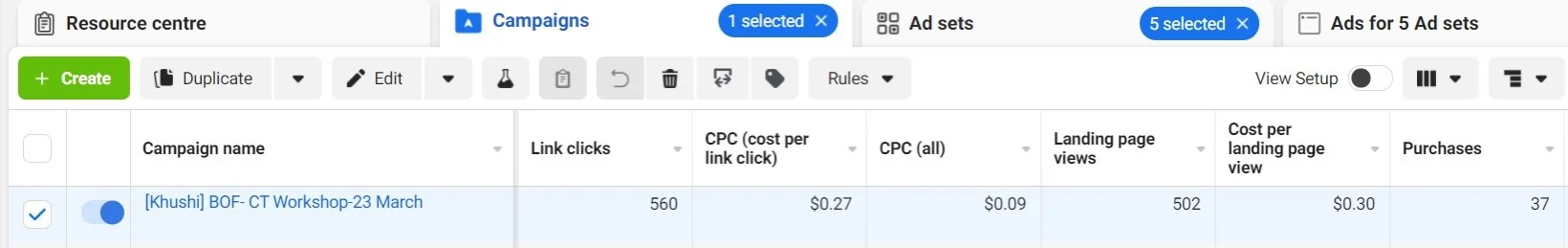 1st workshop —> 37 sales at $3.02 at Cost per purchase resulting in total revenue of $3219 with a total ad spend of C$111.98